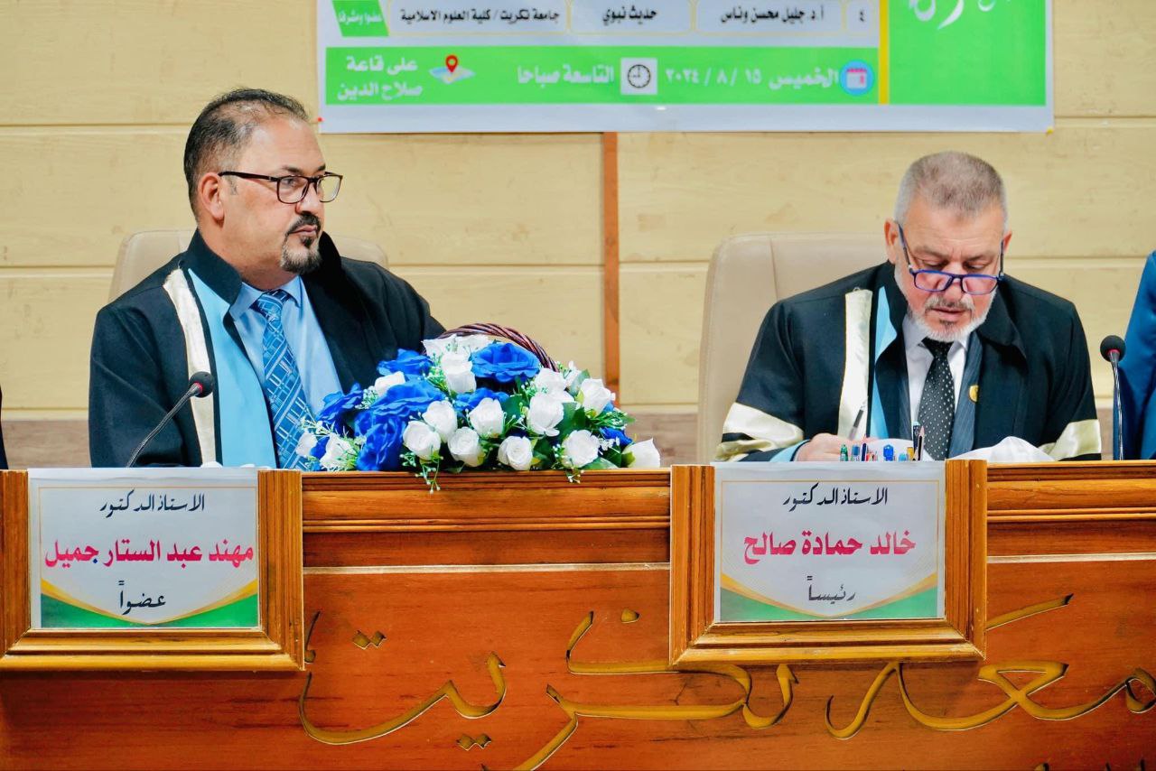 ترأس الاستاذ الدكتور خالد حماده صالح التدريسي في كليتنا قسم علوم القرآن والتربية الإسلامية عضوية لجنة مناقشة رسالة ماجستير في كلية العلوم الإسلامية للطالبة مريم احمد مطلك عن رسالتها الموسومة ( مرويات امهات المؤمنين رضي الله عنهم في تهذيب النفس / دراسة موضوعية ) . اذ تثمن عمادة كلية التربية للعلوم الإنسانية متمثلةً بالسيد عميد الكلية الأستاذ الدكتور عماد حميد احمد جهود اساتيذها في رفع اسم كليتنا من خلال المشاركة بهكذا نشاطات علمية مثمرة.