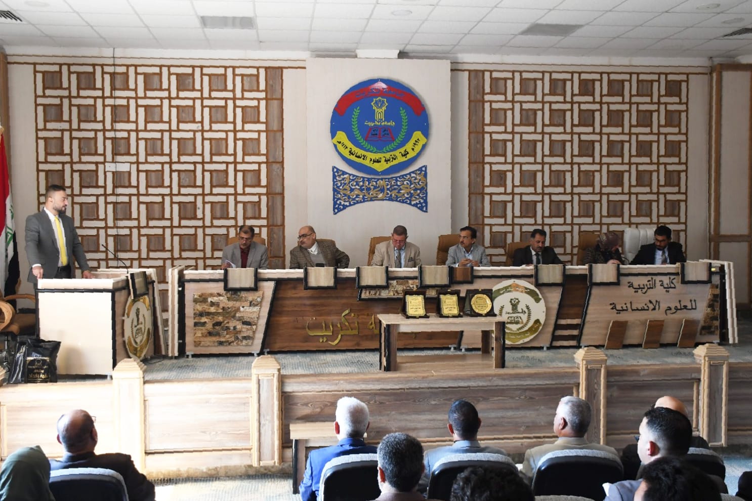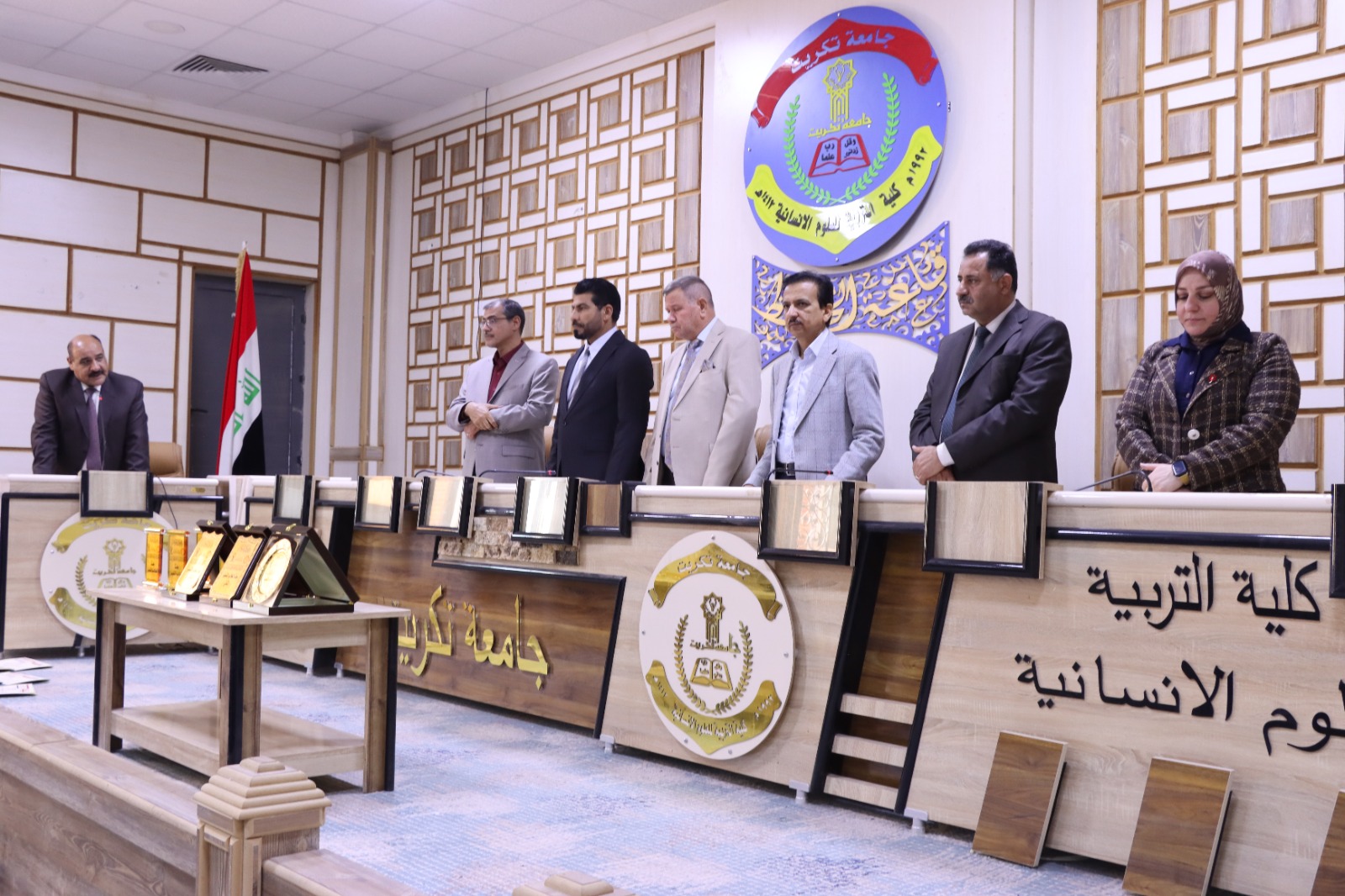 برعاية السيد رئيس جامعة تكريت الاستاذ الدكتور وعد محمود رؤوف وبإشراف السيد عميد كلية التربية للعلوم الإنسانية الأستاذ الدكتور عماد حميد احمد اقامت كليتنا اليوم الأربعاء الموافق (٢٠٢٥/٣/١٢) مؤتمرها العلمي السادس عشر لمناقشة بحوث التخرج لطلبة المرحل المنتهية للعام الدراسي ٢٠٢٤-٢٠٢٥ على قاعة الجاحظ ، اذ بدأ المؤتمر بقراءة آيات من القرآن الكريم ومن ثم كلمة للسيد رئيس اللجنة العلمية للمؤتمر الاستاذ الدكتور رشيد لطيف ابراهيم ، بعدها تمت مناقشة البحوث من قبل اللجنة العلمية، وقد حصل بحث الطالب (علي رمضان كامل) من قسم اللغة الانكليزية على المركز الأول بإشراف الأستاذ الدكتور محمد برجس سليمان ، والبحث الثاني للطالبة (نهلة عبدالله احمد) من قسم الجغرافية بإشراف المدرس الدكتور رافع خضير ابراهيم ، والبحث الثالث للطالب (اسامه يحيى ماهر) من قسم علوم القرآن والتربية الإسلامية بإشراف المدرس الدكتورة نور سعد حمود. وفي ختام المؤتمر تم اعلان أسماء الفائزين بالمراكز الثلاثة الأولى من قبل السيد معاون العميد لشؤون الطلبة الاستاذ الدكتور مثنى مشعان خلف ، وتم تكريم الطلبة الثلاثة الأوائل على الكلية والاقسام والسادة المشرفين والسادة أعضاء لجنة مناقشة البحوث اذ تثمن عمادة كلية التربية للعلوم الإنسانية متمثلةً بالسيد عميد الكلية الاستاذ الدكتور عماد حميد احمد جهود الطلبة الاوائل والاساتذة المشرفين عليهم راجين لهم دوام الموفقية والنجاح في مسيرتهم العلمية.