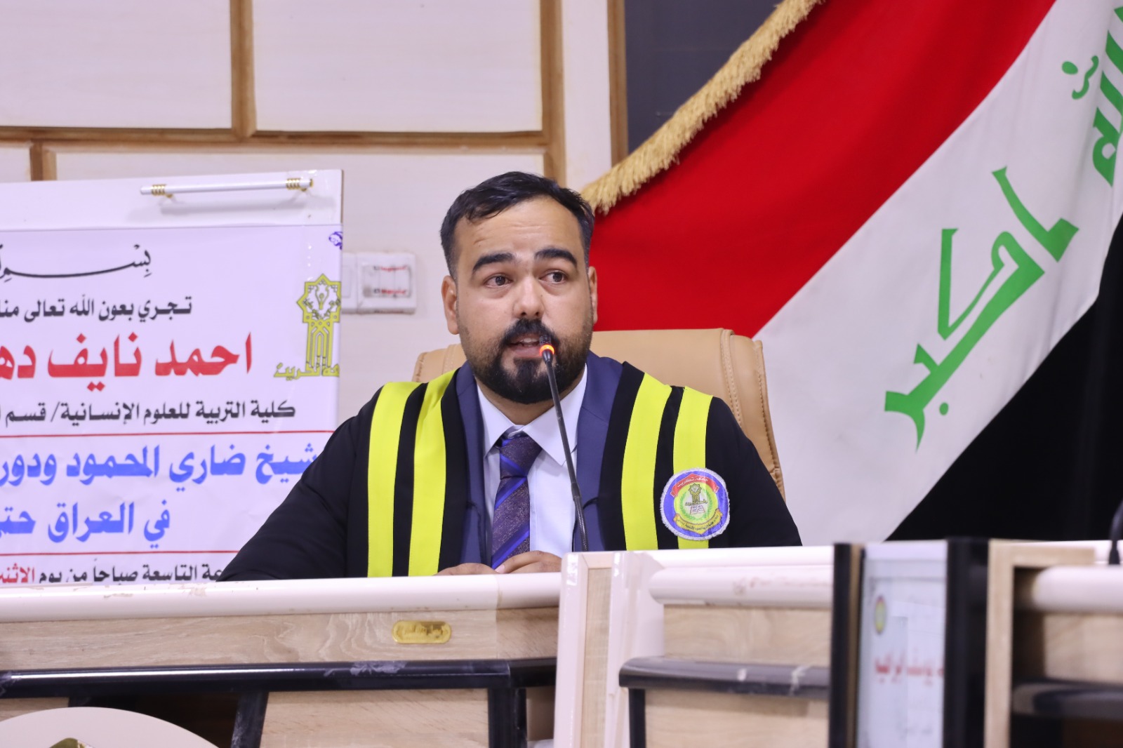 ترأس السيد معالي وزير الثقافة والسياحة والآثار الاستاذ الدكتور احمد فكاك البدراني لجنة مناقشة رسالة ماجستير في كلية التربية للعلوم الإنسانية قسم التاريخ اليوم الاثنين الموافق (19/5/2025) للطالب احمد نايف دهاك و الموسومة (الشيخ ضاري المحمود ودوره السياسي والاجتماعي في العراق حتى عام 1928م).