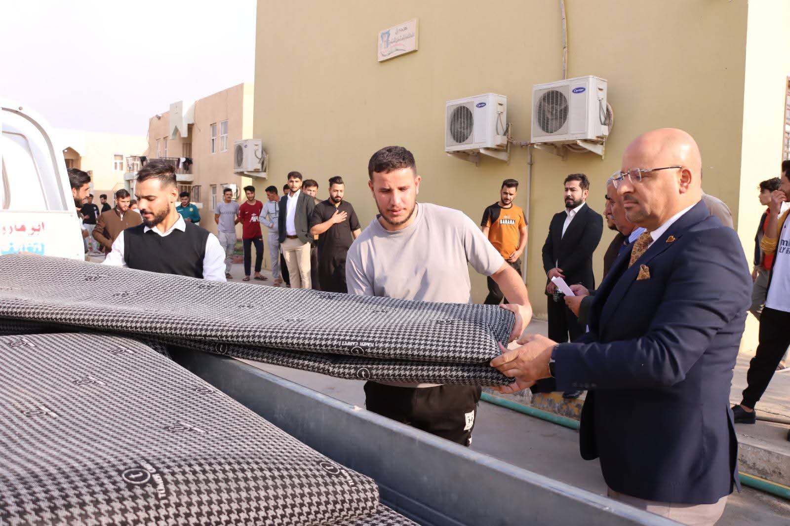 وشهدت الزيارة تجهيز غرف الطلبة بعدد من المستلزمات الضرورية، من بينها توزيع الفرش (الموكيتات)، فضلاً عن متابعة النواقص الأخرى والعمل على تلبيتها بما يضمن تحسين الخدمات المقدمة لهم.