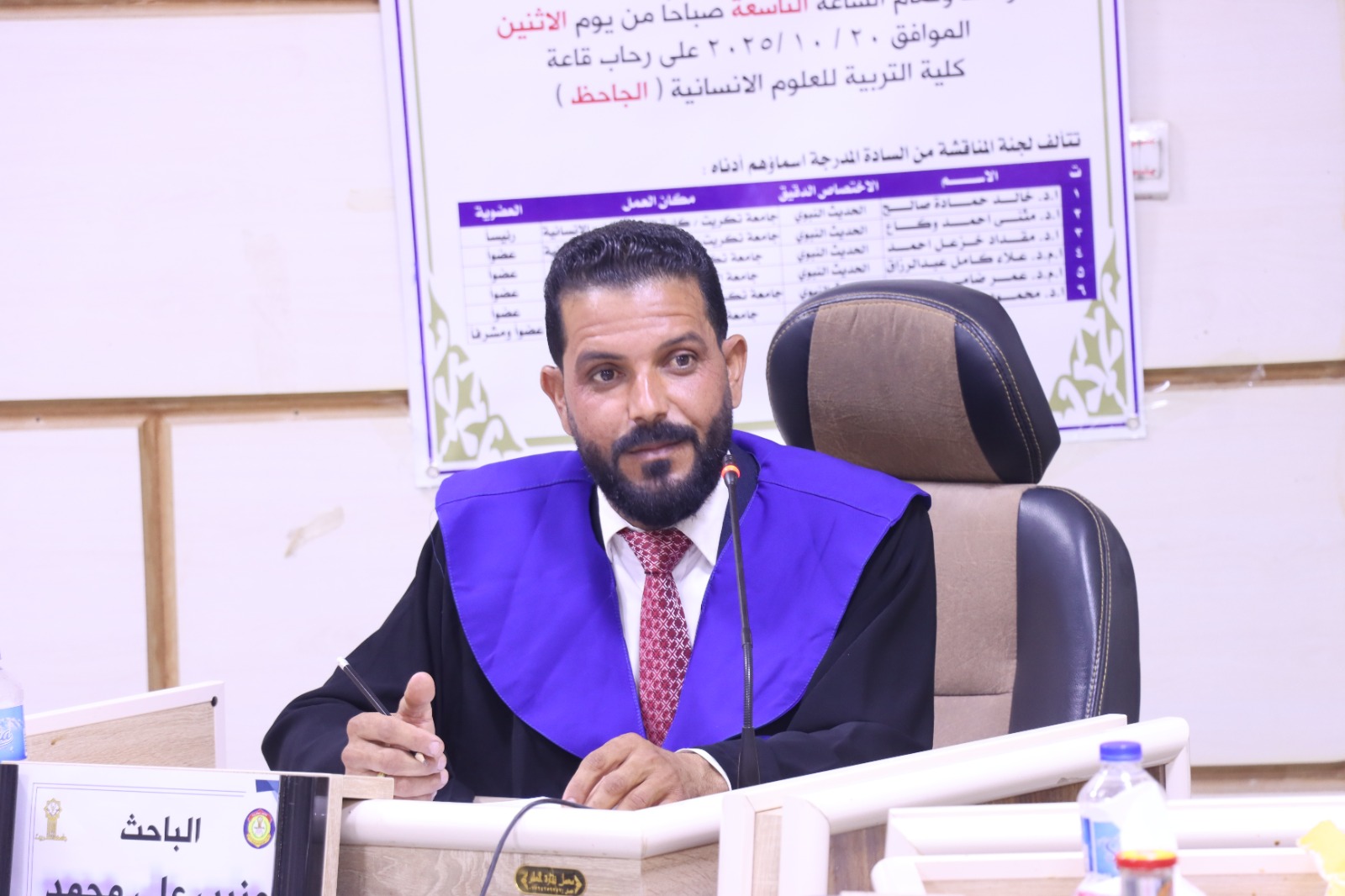 نوقشت في كلية التربية للعلوم الإنسانية قسم علوم القرآن والتربية الإسلامية اليوم الاثنين الموافق (٢٠٢٥/١٠/٢٠) أطروحة الدكتوراه للطالب (منيب علي محمد) الموسومة (الرواة الذين ذكرهم الامام شمس الدين الذهبي في كتابه : ذكر من أسماء من تكلم فيه وهو موثوق وديوان الضعفاء والمتروكين - جمعاً ودراسة من ترجمة ٧١ إلى ترجمة ١٧٠) .