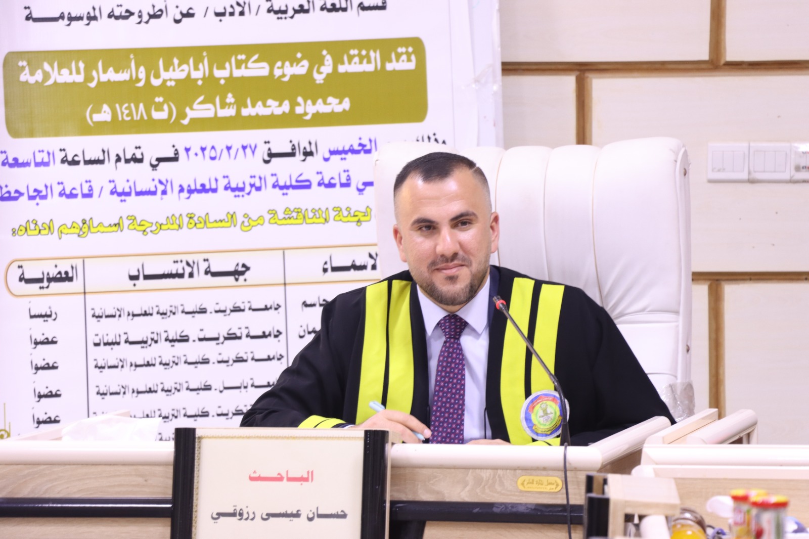 نوقشت في كلية التربية للعلوم الانسانية قسم اللغة العربية اليوم الخميس الموافق ( 27/2/2025 ) اطروحة الدكتوراه للطالب ( حسان عيسى رزوقي ابراهيم ) الموسومة ( نقد النقد في ضوء كتاب اباطيل و اسمار للعلامة محمود محمد شاكر (ت 1418هـ )