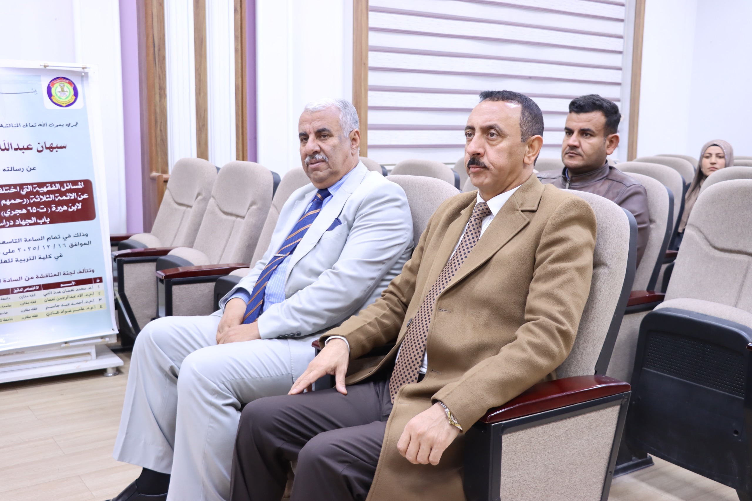 نوقشت في كلية التربية للعلوم الإنسانية قسم علوم القرآن والتربية الاسلامية اليوم الثلاثاء الموافق (16/12/2025) رسالة الماجستير للطالب (سبهان عبدالله خلف العصيبي) الموسومة (المسائل الفقهية التي اختلف فيها الامام ابو حنيفة عن الائمة الثلاثة (رحمهم الله) في كتاب الإفصاح لابن هبيرة (ت560 هـ) من صورة التعزير الى باب الجهاد - دراسة مقارنة).