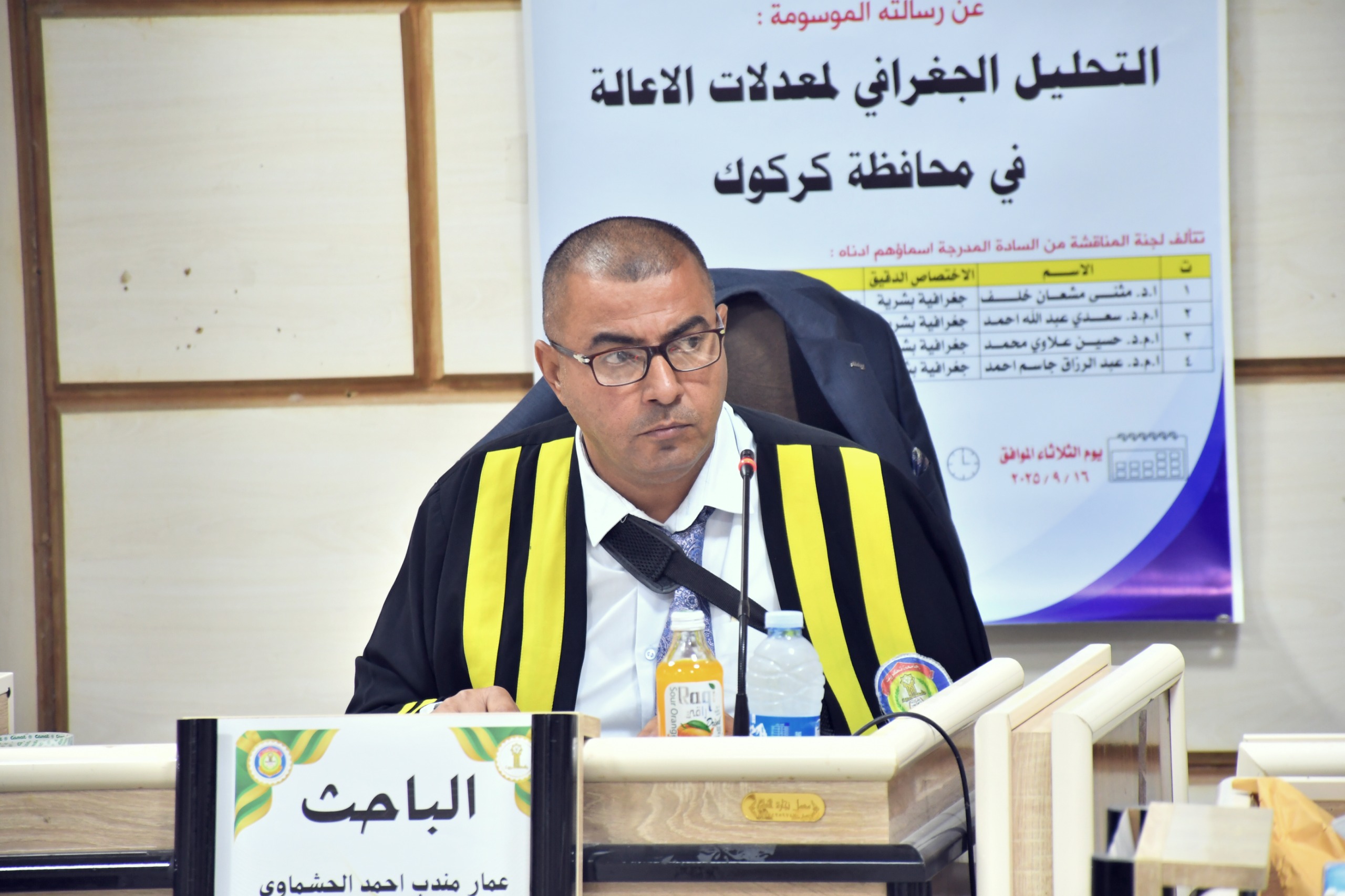 نوقشت في كلية التربية للعلوم الإنسانية قسم الجغرافية اليوم الثلاثاء الموافق (16/9/2025) رسالة الماجستير للطالب عمار مندب احمد و الموسومة (التحليل الجغرافي لمعدلات الاعالة في محافظة كركوك)