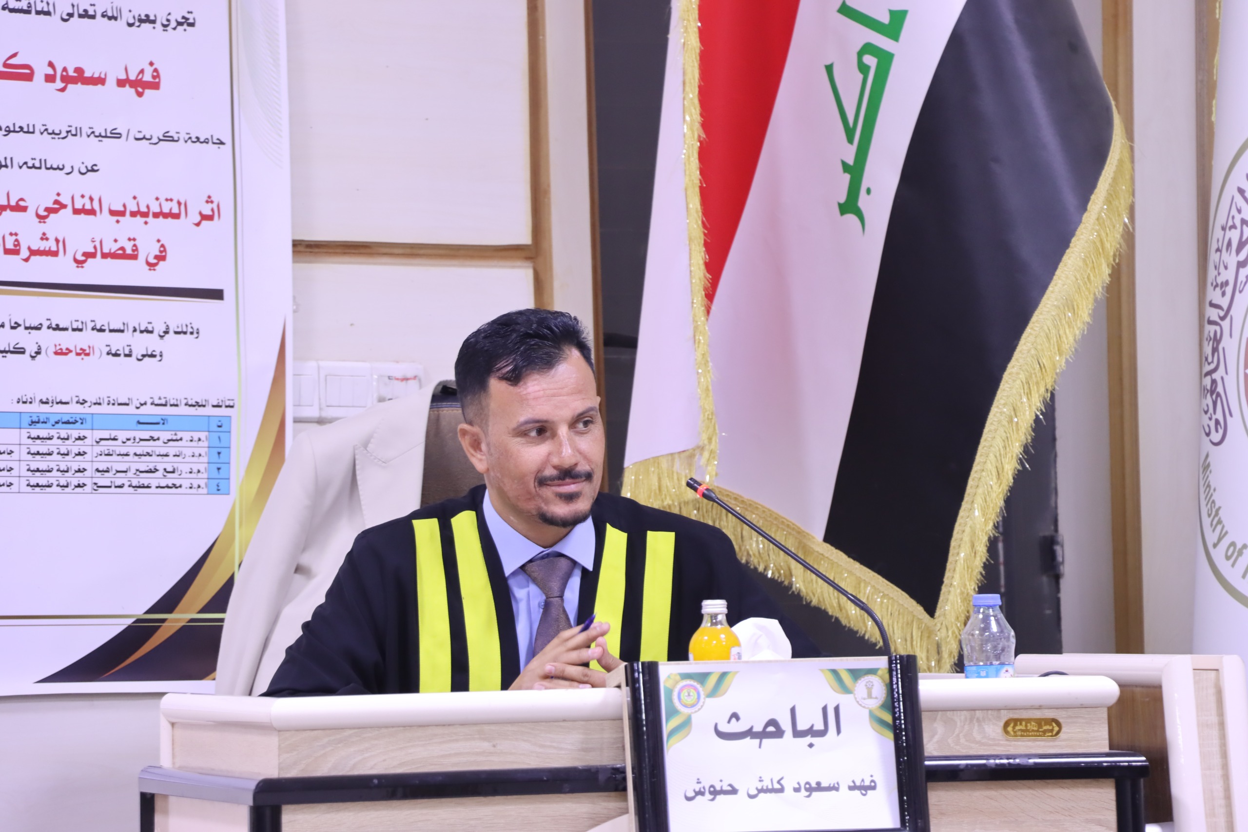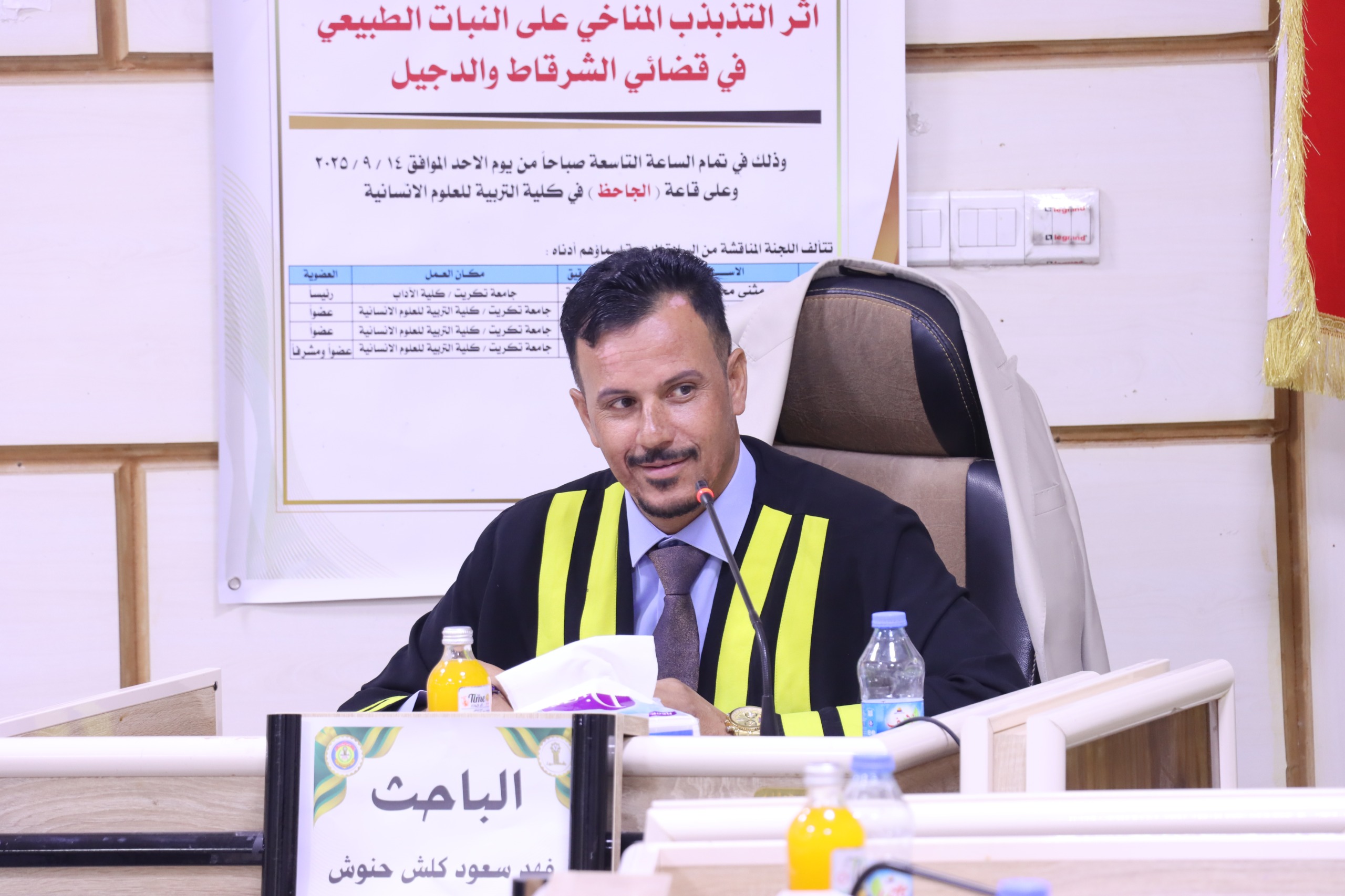 نوقشت في كلية التربية للعلوم الإنسانية قسم الجغرافية اليوم الاحد الموافق (14/9/2025) رسالة الماجستير للطالب فهد سعود كلش و الموسومة (اثر التذبذب المناخي على النبات الطبيعي في قضائي الشرقاط و الدجيل)
