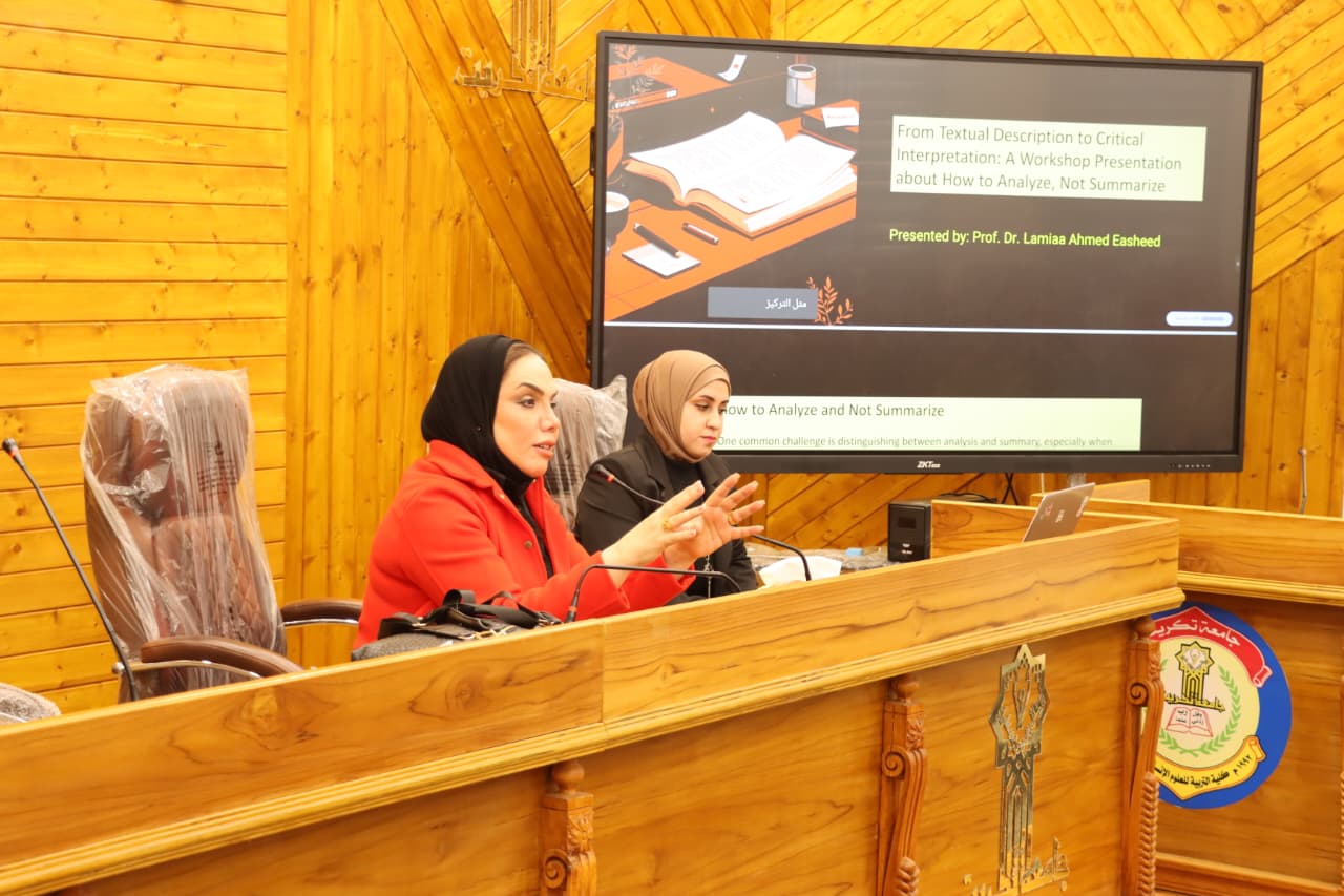 برعاية السيد رئيس جامعة تكريت الأستاذ الدكتور وعد محمود رؤوف، وبإشراف السيد عميد كلية التربية للعلوم الإنسانية الأستاذ الدكتور عماد حميد أحمد، اقام قسم اللغة الانكليزية في كليتنا بالتعاون مع مركز التعليم المستمر دورة علمية بعنوان (من الوصف النصّي إلى التأويل النقدي : دورة حول كيفية التحليل لا التلخيص). اليوم الثلاثاء الموافق (٢٠٢٦/٢/٣) .
