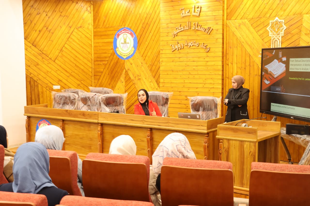 اذ تهدف الدورة إلى تنمية مهارات التحليل النقدي لدى الطلبة والباحثين، والانتقال من الأسلوب الوصفي والتلخيصي للنصوص إلى الفهم العميق والتأويل المنهجي القائم على القراءة التحليلية، فضلاً عن تعريف المشاركين بآليات التفريق بين التلخيص والتحليل، وتزويدهم بالأدوات النقدية اللازمة لفهم النصوص الأدبية والأكاديمية وفق مناهج حديثة.