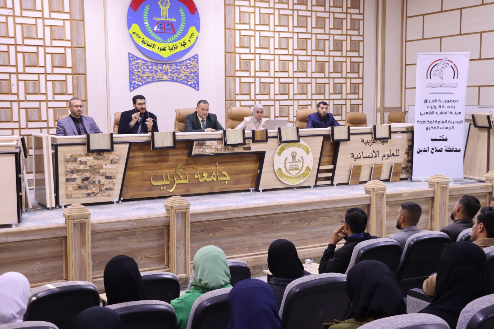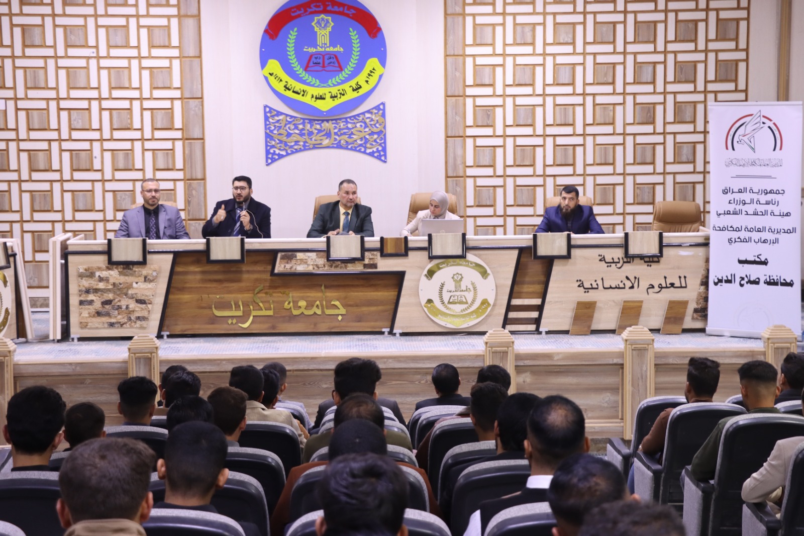 برعاية السيد رئيس جامعة تكريت الاستاذ الدكتور وعد محمود رؤوف وباشراف السيد عميد كلية التربية للعلوم الإنسانية الاستاذ الدكتور عماد حميد احمد اقام قسم علوم القرآن والتربية الإسلامية في كليتنا بالتعاون مع مركز التعليم المستمر في جامعة تكريت و مكتب المديرية العامة لمكافحة الارهاب الفكري _صلاح الدين اليوم الاثنين الموافق (٢٠٢٤/١١/٢٥) بعنوان ( دور الاستاذ الجامعي في تعزيز روح التسامح ، وحرية التعبير لدى طلاب الجامعة، وطرق محاربة الافكار المتطرفة) . اذ هدفت الندوة التي ادارها كل من الاستاذ المساعد الدكتور خالد عبيد صالح والاستاذ المساعد الدكتور موسى طه صياح والمدرس الدكتور نور سعد حمود و السيد انور رزوق محمود والشيخ علي جادالله علي من مكتب المديرية العامة لمكافحة الارهاب الفكري _صلاح الدين إلى بيان ما للاستاذ الجامعي من تأثير في بث وتعزيز قيم التسامح واستقامة الفكر وابتعاده عن التطرف لدى الطلبة . و بيان اثار التطرف الفكري على الاوساط الجامعية. ووضع سبل عملية للوقاية من التطرف الفكري. بالإضافة إلى اشراك الطلبة بعملية التوعية ضد الانخراط في الافكار المتطرفة. اذ تثمن عمادة كلية التربية للعلوم الإنسانية متمثلةً بالسيد عميد الكلية الأستاذ الدكتور عماد حميد احمد جهود السادة المحاضرين في الندوة راجين لهم دوام الموفقية والعطاء في مسيرتهم العلمية. #شعبة الإعلام والاتصال الحكومي - كلية التربية للعلوم الإنسانية - جامعة تكريت