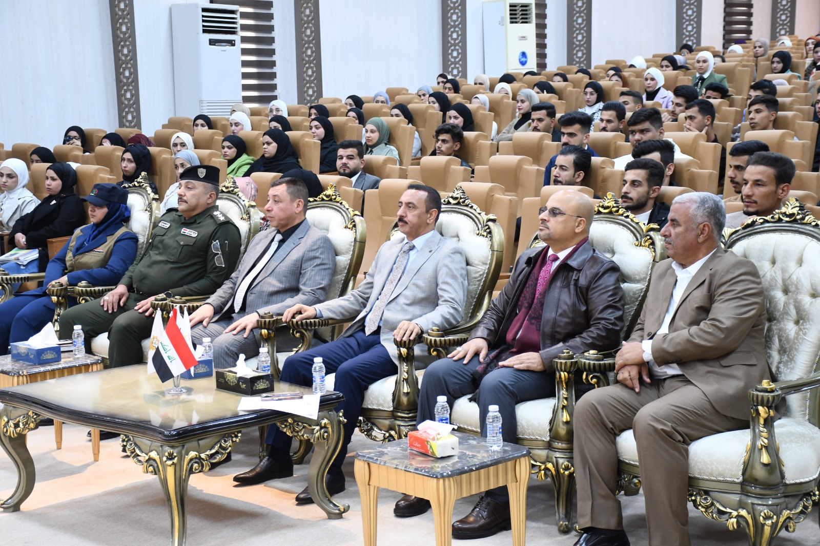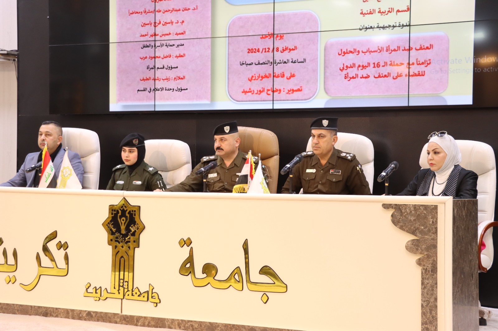 برعاية السيد رئيس جامعة تكريت الاستاذ الدكتور وعد محمود رؤوف وباشراف السيد عميد كلية التربية للعلوم الإنسانية الاستاذ الدكتور عماد حميد احمد اقام قسم التربية الفنية في كليتنا بالتعاون مع قسم الأسرة والطفل في قيادة شرطة صلاح الدين ومركز التعليم المستمر ندوة توجيهية بعنوان (العنف ضد المرأة - الأسباب والحلول تزامناً مع حملة ال١٦ يوم الدولي للقضاء على العنف ضد المرأة) اليوم الأحد الموافق (٢٠٢٤/١٢/٨). اذ هدفت الندوة التي ادارها كل من المدرس الدكتور ياسين فرج ياسين والعقيد خميس مظهر احمد والعقيد فاضل محمود عرب والملازم زينب رشيد لطيف إلى مناقشة موضوع العنف ضد المرأة ومناقشة حالات مرت على قسم الأسرة والطفل وكيف تعامل معها القسم وارشاد المعنفات لطرق تقديم الشكوى واللجوء للأقسام المختصة. وقد تتضمن الندوة عرض فلم قصير واستعراض لعمل قسم الأسرة والطفل وشعبة المرأة وماتقوم به ، وحوارات ونقاشات بين الجمهور والمحاضرين.