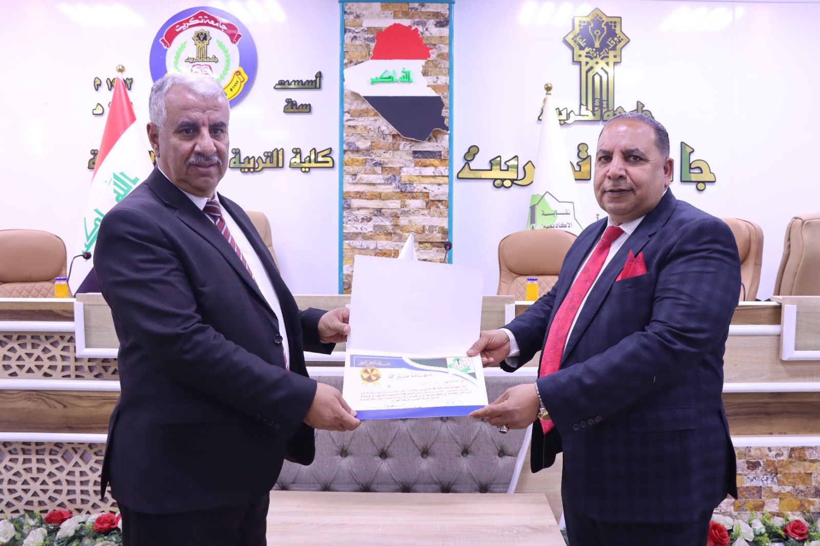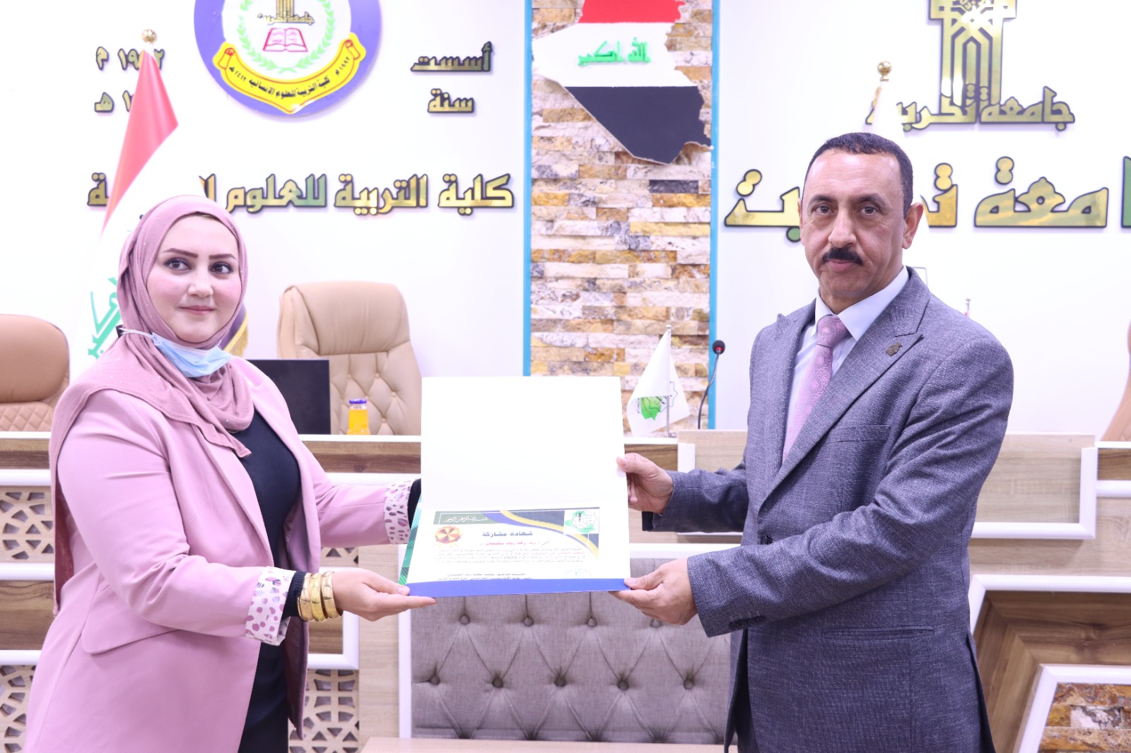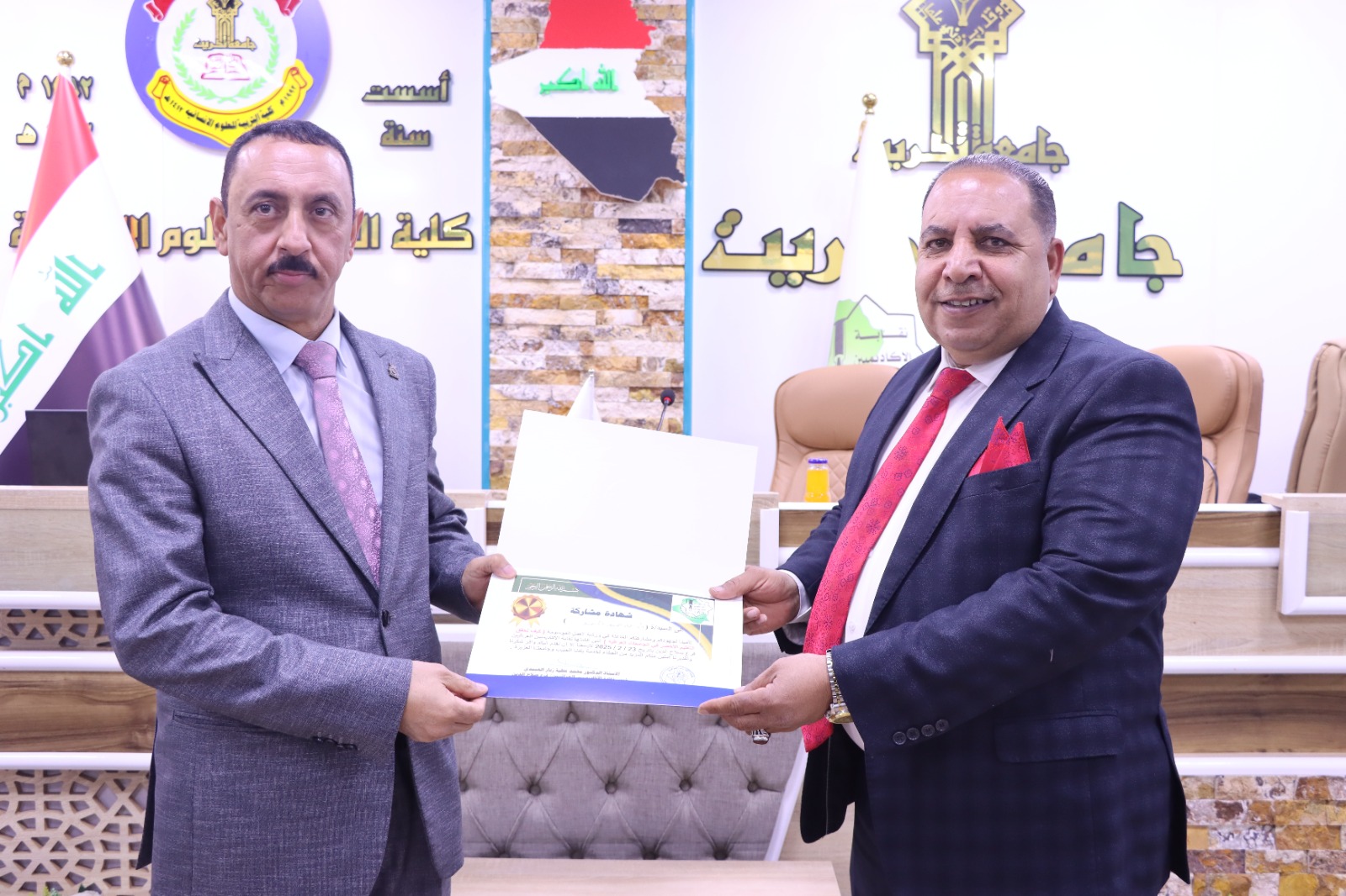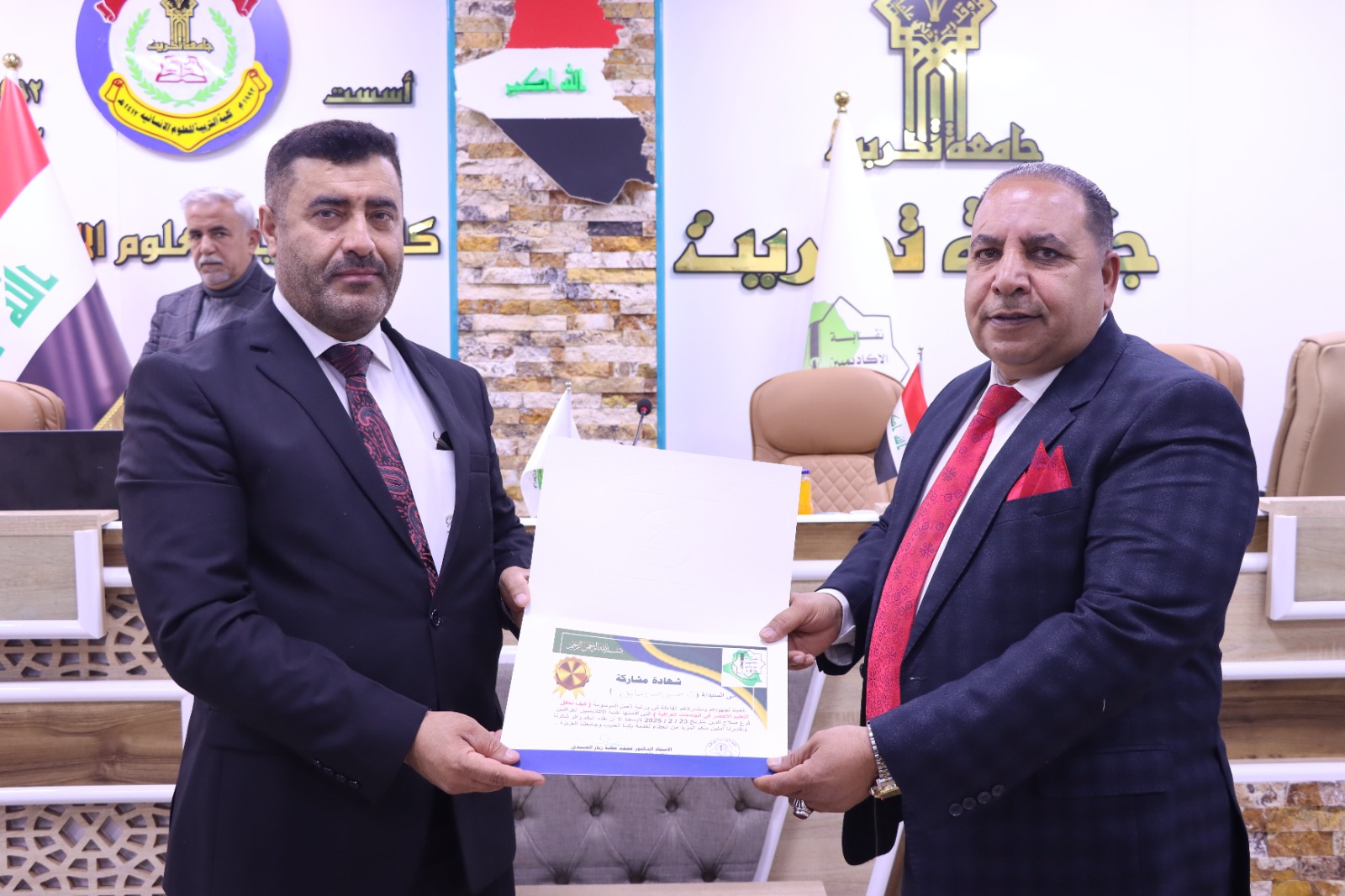 وفي ختام الدورة كرم السيد عميد كلية التربية للعلوم الإنسانية الاستاذ الدكتور عماد حميد احمد السادة المحاضرين في الدورة بشهادات تقديرية تثمينا لجهودهم المبذولة مؤكدا دعم الكلية لهكذا نشاطات من شأنها توعوية افراد المجتمع ، كما قدم الأستاذ الدكتور محمد عطية زبار رئيس الأكاديميين العراقيين شهادات مشاركة للسادة الحضور في الورشة ، راجين للجميع الموفقية والسداد في مسيرتهم العلمية.