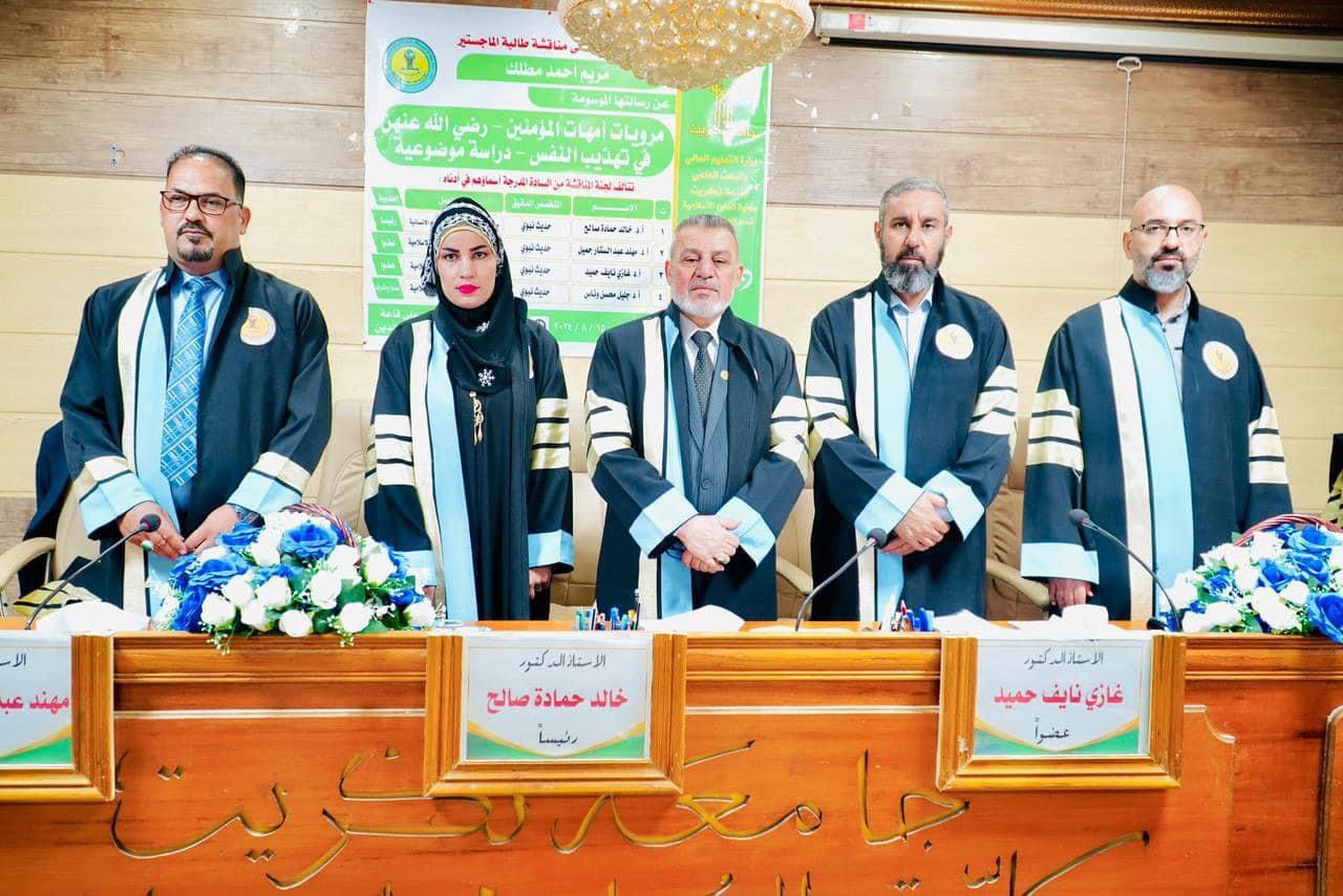 ترأس الاستاذ الدكتور خالد حماده صالح التدريسي في كليتنا قسم علوم القرآن والتربية الإسلامية عضوية لجنة مناقشة رسالة ماجستير في كلية العلوم الإسلامية للطالبة مريم احمد مطلك عن رسالتها الموسومة ( مرويات امهات المؤمنين رضي الله عنهم في تهذيب النفس / دراسة موضوعية ) . اذ تثمن عمادة كلية التربية للعلوم الإنسانية متمثلةً بالسيد عميد الكلية الأستاذ الدكتور عماد حميد احمد جهود اساتيذها في رفع اسم كليتنا من خلال المشاركة بهكذا نشاطات علمية مثمرة.