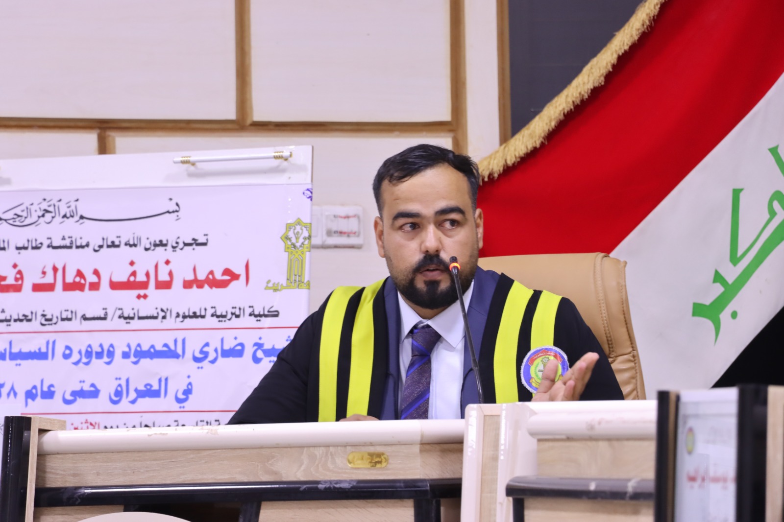 ترأس السيد معالي وزير الثقافة والسياحة والآثار الاستاذ الدكتور احمد فكاك البدراني لجنة مناقشة رسالة ماجستير في كلية التربية للعلوم الإنسانية قسم التاريخ اليوم الاثنين الموافق (19/5/2025) للطالب احمد نايف دهاك و الموسومة (الشيخ ضاري المحمود ودوره السياسي والاجتماعي في العراق حتى عام 1928م).