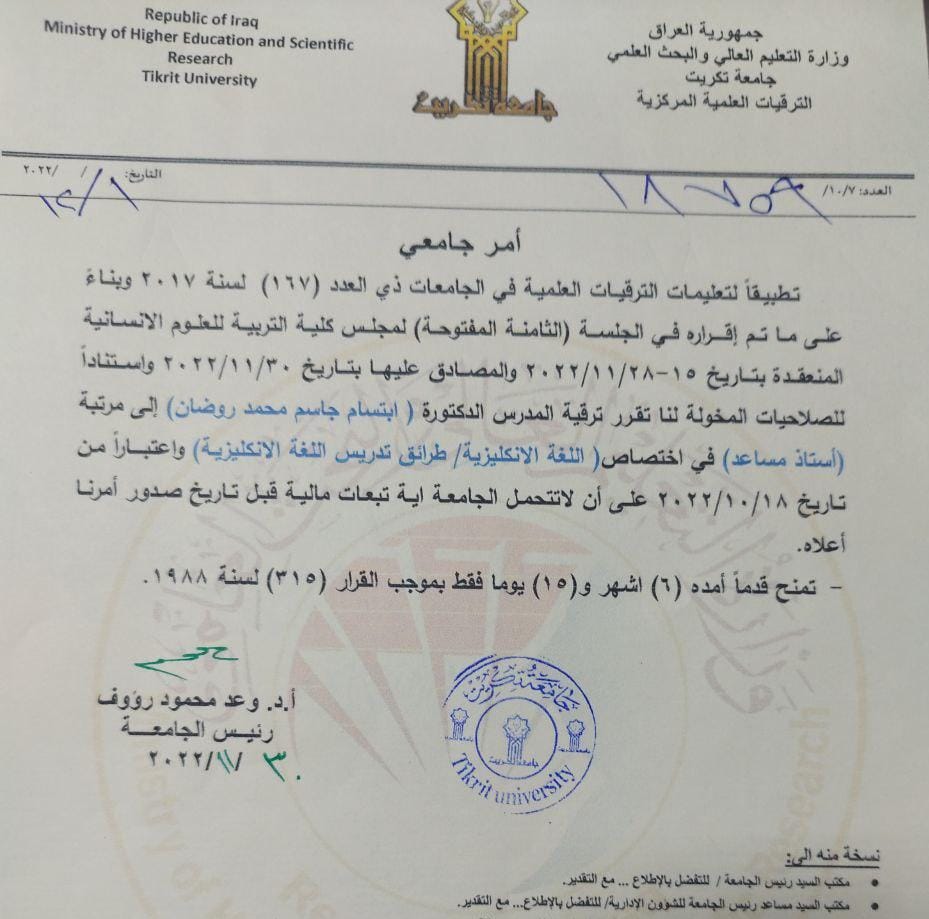 ترقية علمية ( أ.م.د صبحي محمد جاسم )