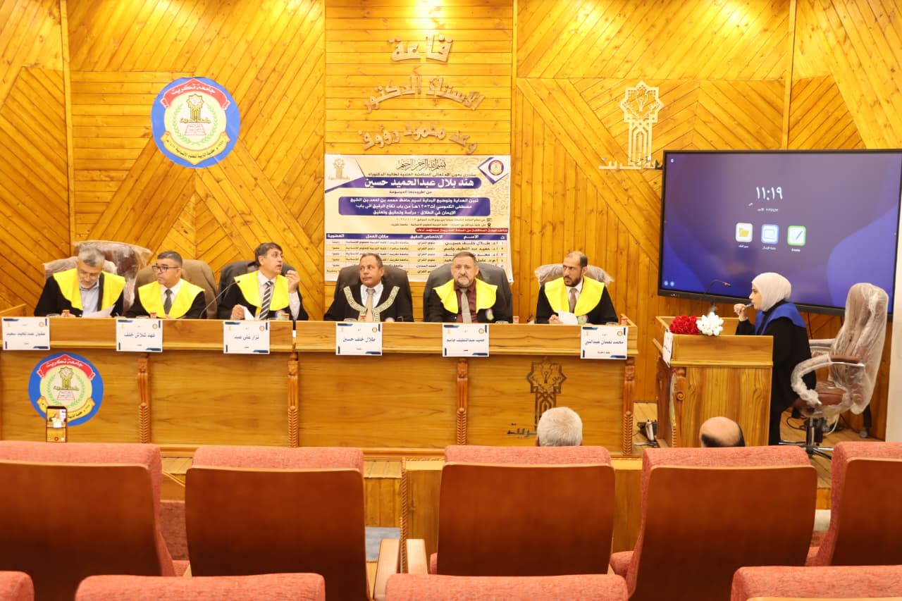نوقشت في كلية التربية للعلوم الإنسانية قسم علوم القرآن والتربية الاسلامية اليوم الاحد الموافق (2026/4/12) اطروحة الدكتوراه للطالبة (هند بلال عبدالحميد) الموسومة (تبين الهداية وتوضيح البداية لسيد حافظ محمد بن احمد بن الشيخ مصطفى الكدوسي (ت1253هـ) من باب نكاح الرقيق الى باب : الايمان في الطلاق – دراسة وتحقيق وتعليق).