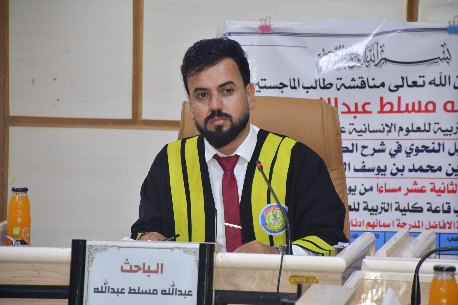 نوقشت في كلية التربية للعلوم الإنسانية قسم اللغة العربية اليوم الاثنين الموافق (26/8/2024) رسالة الماجستير للطالب عبدالله مسلط عبدالله ، الموسومة (التعليل النحوي في شرح الكافية للعلامة جلال الدين محمد بن يوسف الحلوائي (ت٨٣٨ه)))