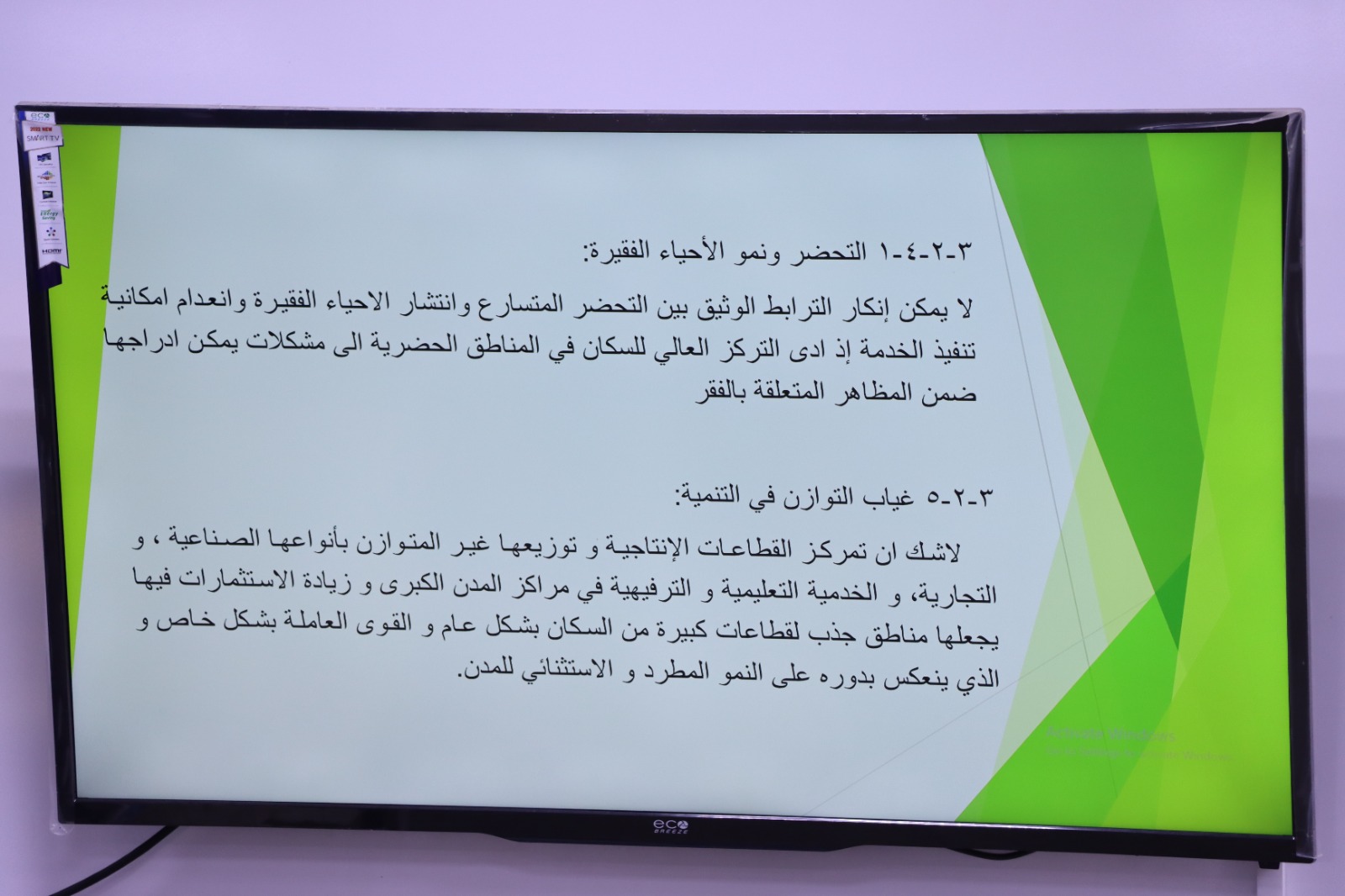 برعاية السيد رئيس جامعة تكريت الاستاذ الدكتور وعد محمود رؤوف وباشراف السيد عميد كلية التربية للعلوم الإنسانية الاستاذ الدكتور عماد حميد احمد اقام قسم الجغرافية في كليتنا بالتعاون مع مركز التعليم المستمر ندوة علمية بعنوان (التحضر وانعكاسه على البيئة الحضرية فجوة الخدمات وخلل التنمية) اليوم الاثنين الموافق (٢٠٢٤/١/٢٣). اذ هدفت الندوة التي ادارها كل من الاستاذ الدكتور رياض عبدالله احمد والاستاذ المساعد الدكتور عبدالرزاق جاسم احمد والاستاذ المساعد الدكتوة رغد سعيد عبدالحميد والمدرس الدكتور عبدالله دخيل حسن والمدرس المساعد منار محمد ابراهيم إلى التعرف على عملية التحضر التي تسير بوتيرة متصاعدة, وان هذا التصاعد في وتيرة التحضر غير مصحوبة بتنمية محلية تساعد في عملية التخفيف من ظاهرة الفقر الحضري التي تتزايد مع ازدياد التحضر وتأثيره في انتشار نقص الخدمات الحضرية وانعكاساته على امكانية تنمية المشاريع الخدمية داخل الحيز الحضري ، حيث يجب العمل على تحسين الواقع الريفي لتقليل الهجرة من الريف الى المدينة من خلال تنفيذ المشاريع الخدمية والوظيفية ، والعمل على مواكبة التطور الحضري الحاصل داخل المدن بمرونة عالية لغرض موائمة بين المشاريع الخدمية وبين النمو السكاني العالي ، والعمل على تخفيض مستوى الفقر الحضري من خلال زيادة الخدمات المقدمة لتقليل الفجوة الحاصلة بين النمو من جهة وبين مفردات الخدمات من جهة اخرى ويتم ذلك من خلال العمل مع الادارة الحضرية . اذ تثمن عمادة كلية التربية للعلوم الإنسانية متمثلةً بالسيد عميد الكلية الأستاذ الدكتور عماد حميد احمد جهود اساتيذ قسم الجغرافية في إقامة هكذا ندوات علمية مثمرة ، راجين لهم دوام الموفقية والعطاء خدمة لكليتنا ولجامعتنا الحبيبة.