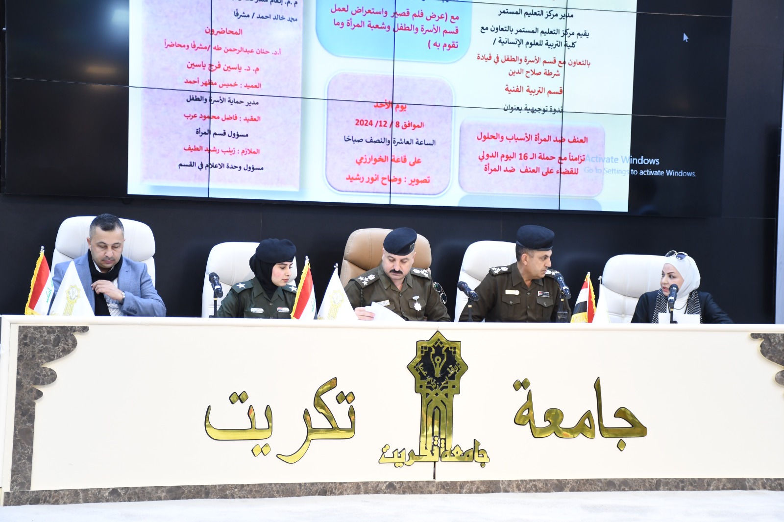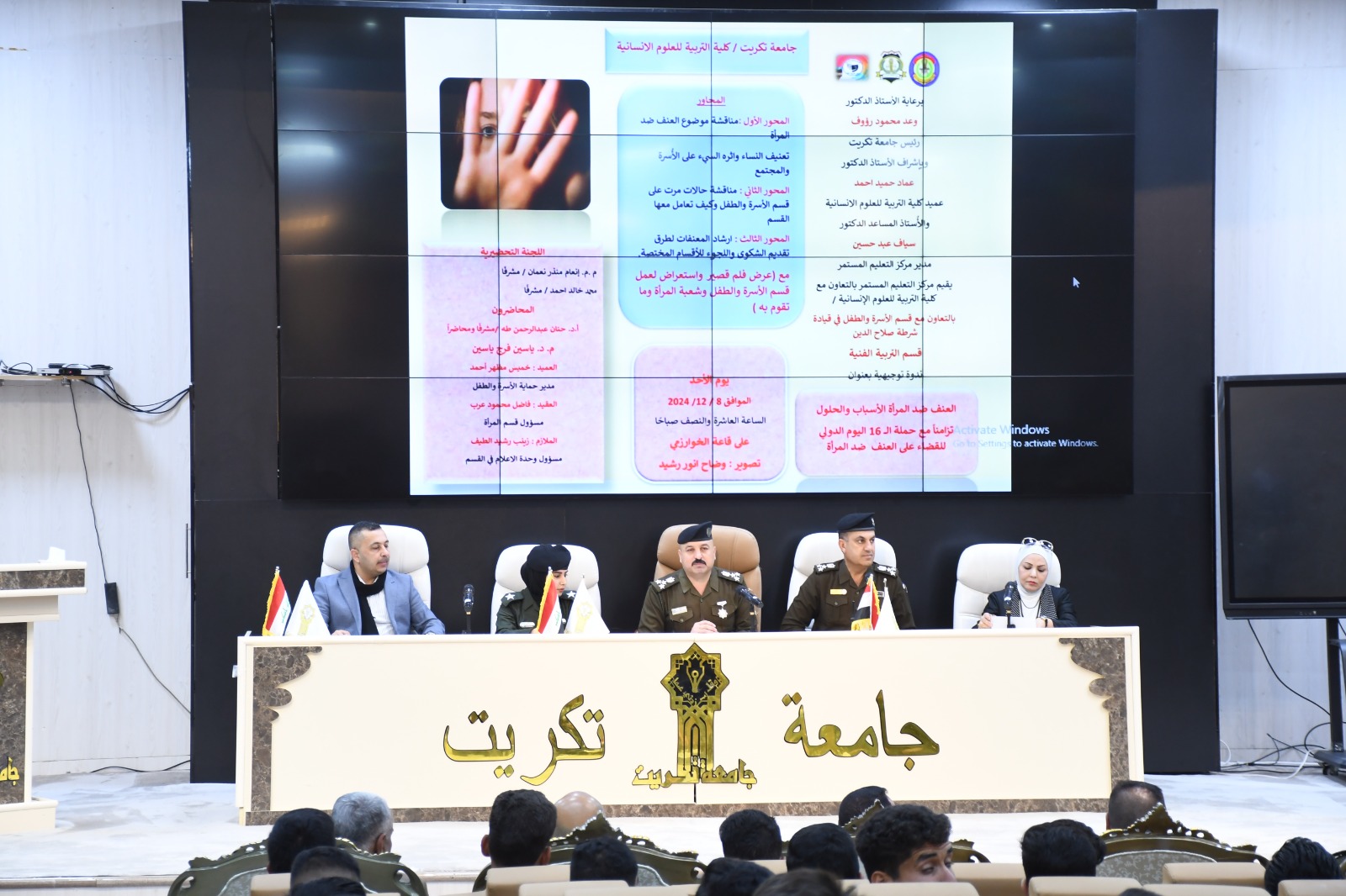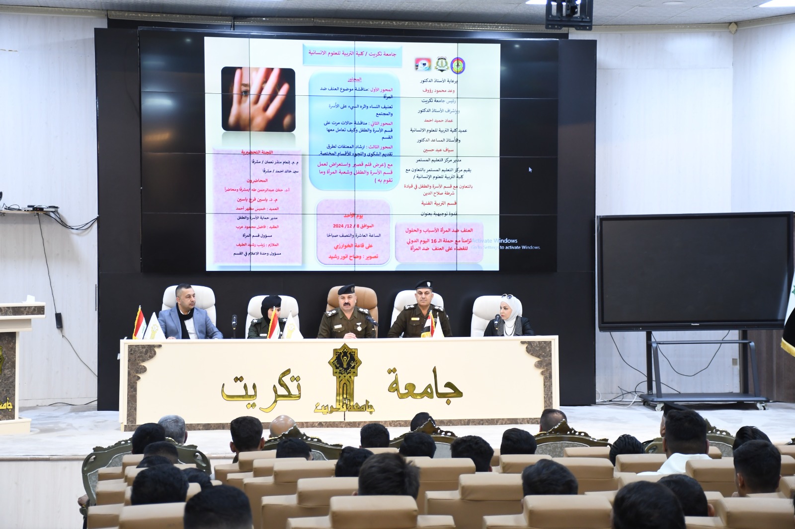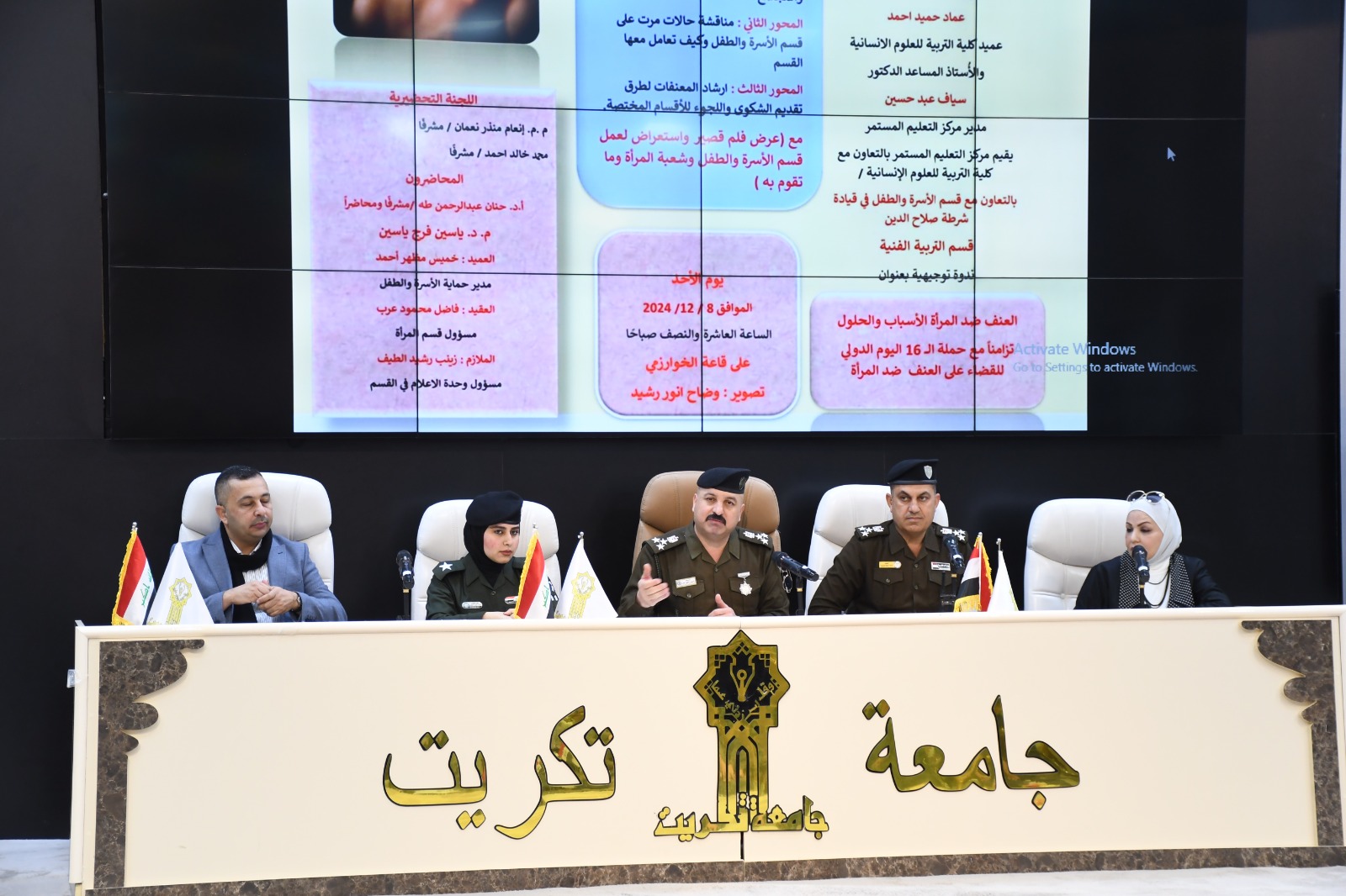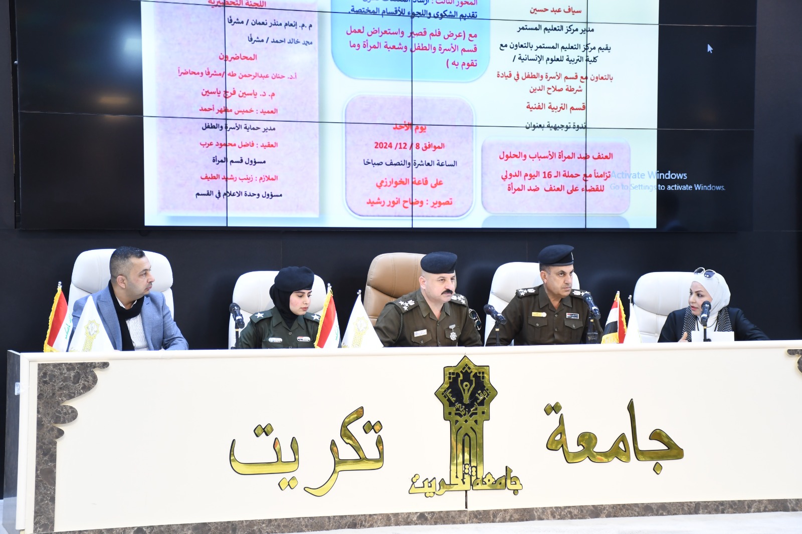 برعاية السيد رئيس جامعة تكريت الاستاذ الدكتور وعد محمود رؤوف وباشراف السيد عميد كلية التربية للعلوم الإنسانية الاستاذ الدكتور عماد حميد احمد اقام قسم التربية الفنية في كليتنا بالتعاون مع قسم الأسرة والطفل في قيادة شرطة صلاح الدين ومركز التعليم المستمر ندوة توجيهية بعنوان (العنف ضد المرأة - الأسباب والحلول تزامناً مع حملة ال١٦ يوم الدولي للقضاء على العنف ضد المرأة) اليوم الأحد الموافق (٢٠٢٤/١٢/٨). اذ هدفت الندوة التي ادارها كل من المدرس الدكتور ياسين فرج ياسين والعقيد خميس مظهر احمد والعقيد فاضل محمود عرب والملازم زينب رشيد لطيف إلى مناقشة موضوع العنف ضد المرأة ومناقشة حالات مرت على قسم الأسرة والطفل وكيف تعامل معها القسم وارشاد المعنفات لطرق تقديم الشكوى واللجوء للأقسام المختصة. وقد تتضمن الندوة عرض فلم قصير واستعراض لعمل قسم الأسرة والطفل وشعبة المرأة وماتقوم به ، وحوارات ونقاشات بين الجمهور والمحاضرين.
